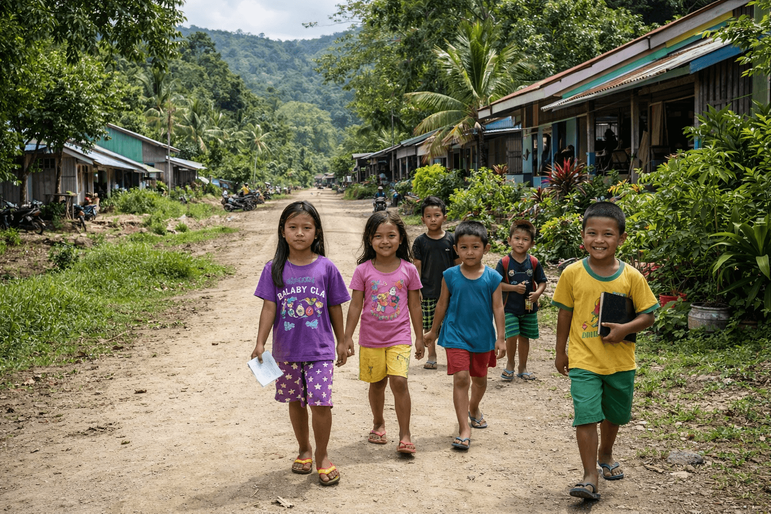Anak-anak berjalan di jalan desa di pedalaman Mahakam Ulu.