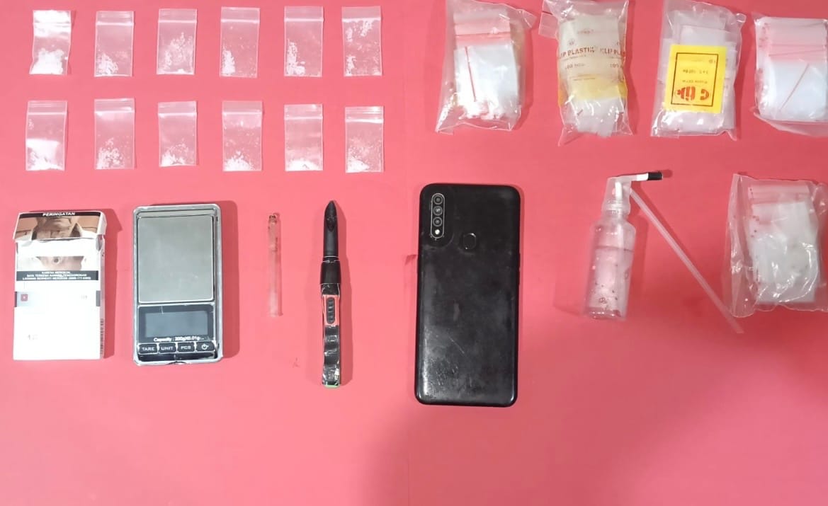 Selain itu, polisi turut mengamankan sejumlah barang bukti lain berupa lima plastik kosong, timbangan digital, alat hisap, pipet kaca, sedotan runcing, kotak rokok.